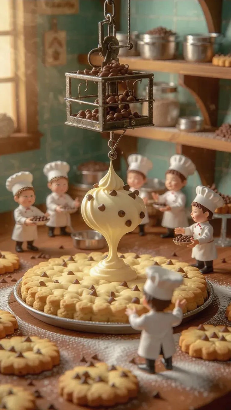 A whimsical cookie factory where a massive cookie is being baked by tiny bakers. A mini lift carries a large dollop of cookie dough, while small chefs sprinkle chocolate chips using tiny hands. Some bakers shape the dough into various forms, while others place them on baking trays. The sweet smell of baking cookies fills the air, with a cozy bakery scene in the background.