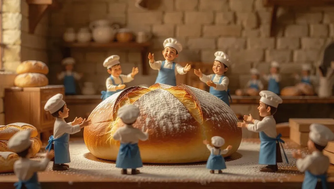 A delightful bakery where a massive loaf of bread is being formed by thumb-sized bakers. A tiny lift raises a giant dough ball, while small chefs shape it with little hands. Some bakers sprinkle flour, while others check the oven. The comforting scent of baking bread spreads, with a quaint bakery setting in the background.
