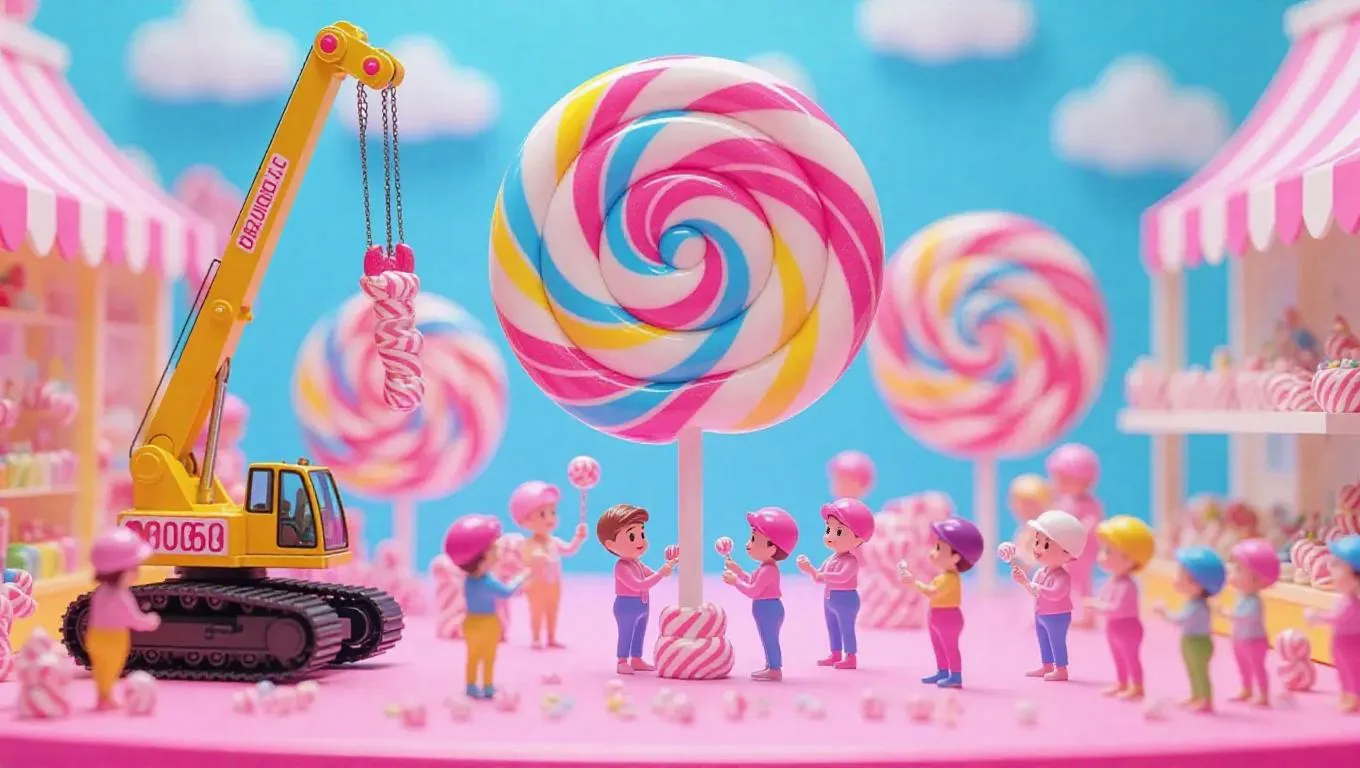 A quirky candy workshop where a giant lollipop is being created by tiny candy makers. A miniature crane lifts a huge candy base, while small workers swirl colors and flavors using tiny spoons. Some confectioners wrap the lollipops, while others sample the sweets. The sweet smell of candy fills the air, with a colorful candy shop backdrop.