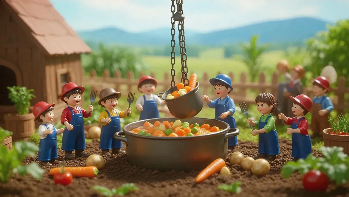A playful farm scene where a gigantic vegetable stew is being stirred by tiny farmers. A tiny lift lowers a massive pot, while small workers add vegetables like carrots and potatoes using tiny forks. Some farmers stir the stew enthusiastically, while others taste test the flavors. The earthiness of fresh produce fills the air, with a rustic farm setting in the background.