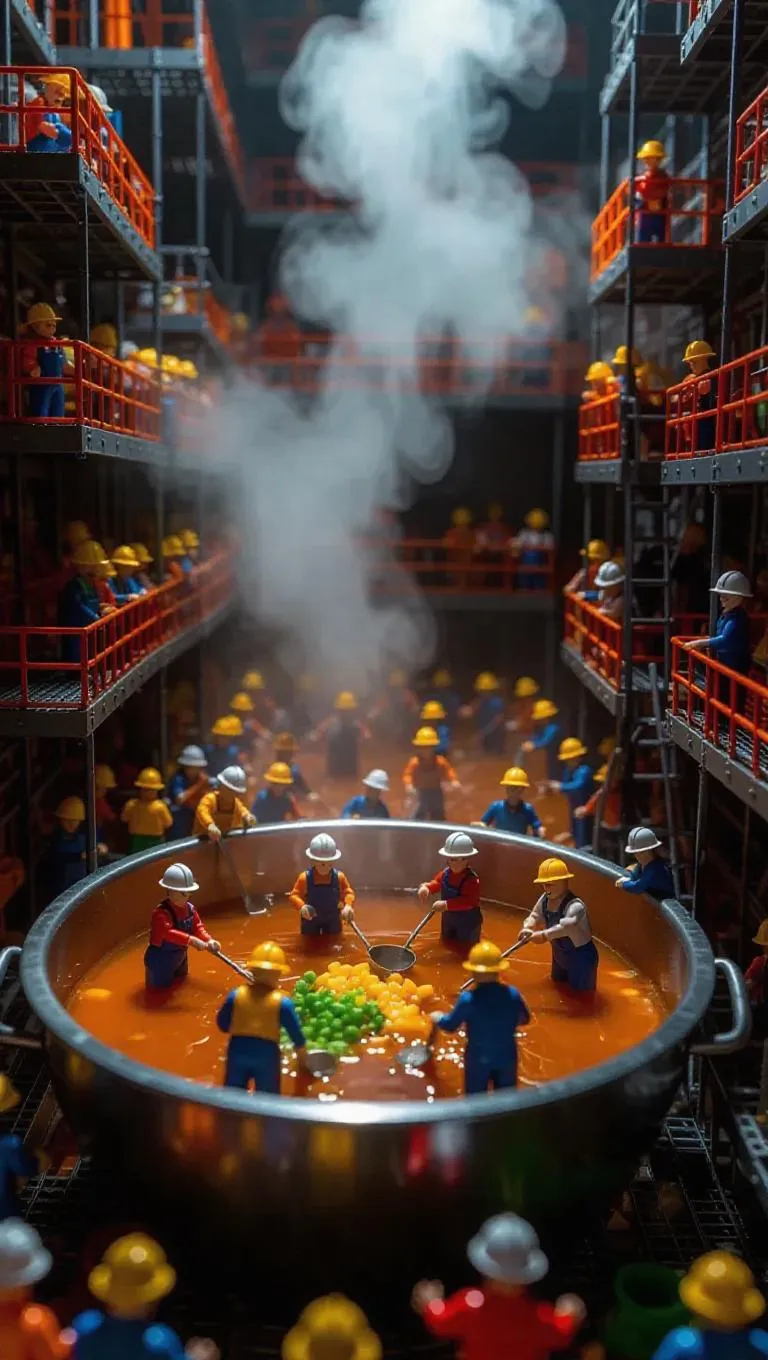 A team of thumb-sized workers in safety helmets and aprons is working inside a massive soup bowl. Some are stirring the broth with giant ladles, others are chopping vegetables on a miniature conveyor belt, while steam rises like factory smoke. The whole scene looks like a bustling soup factory, with scaffolding and ladders inside the bowl.