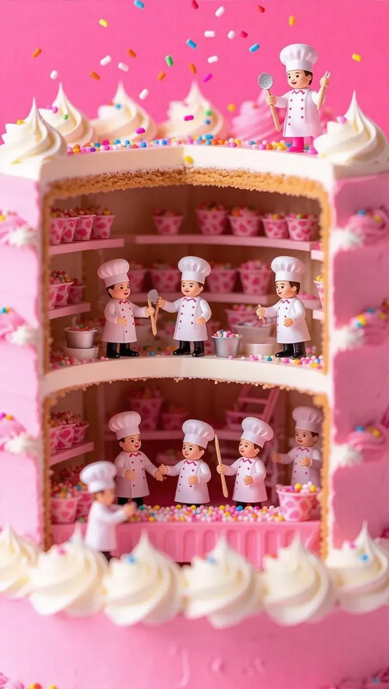 A team of thumb-sized bakers in chef hats and coats is working inside a gigantic cake. Some are icing the layers with oversized spatulas, others are arranging decorations on a tiny conveyor belt, while sprinkles fall like confetti. The whole scene looks like a lively bakery, with shelves and ladders inside the cake.