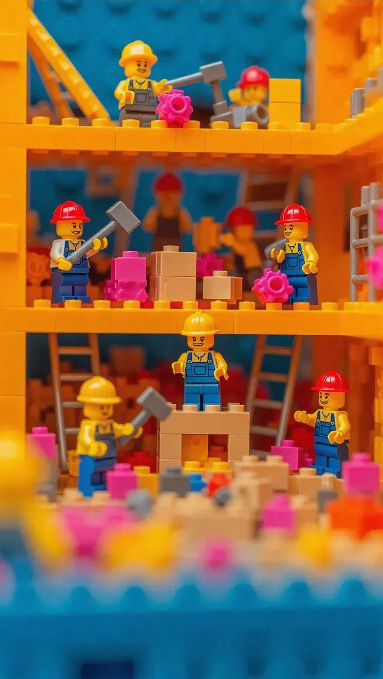 A team of thumb-sized builders in hard hats and tool belts is working inside a giant toy box. Some are assembling blocks with gigantic hammers, others are painting figurines on a miniature assembly line, while toy dust floats like glitter. The whole scene looks like a busy construction site, with beams and ladders inside the box.