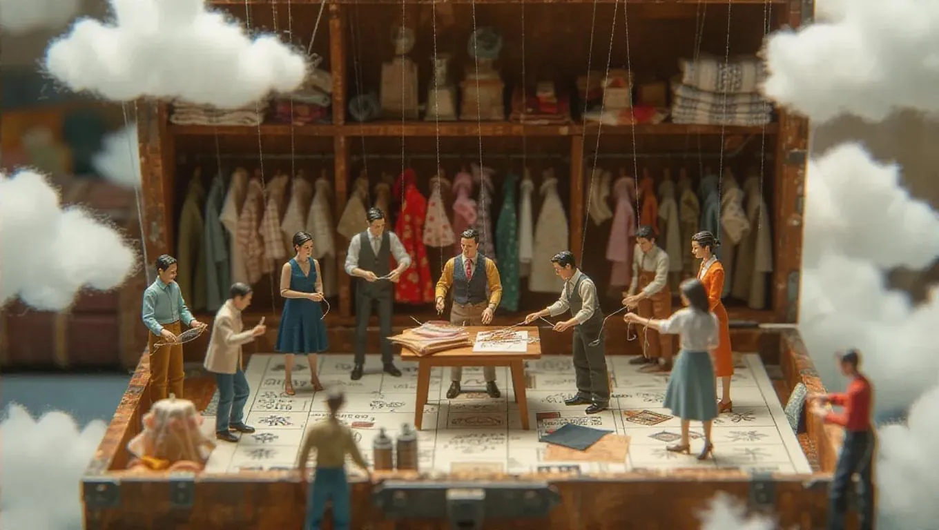 A team of thumb-sized fashion designers in stylish outfits is creating garments inside a massive sewing box. Some are stitching fabrics with oversized needles, others are sketching designs on a tiny table, while strands of thread drift like clouds. The whole scene looks like a fashionable workshop, with fabrics and patterns inside the box.