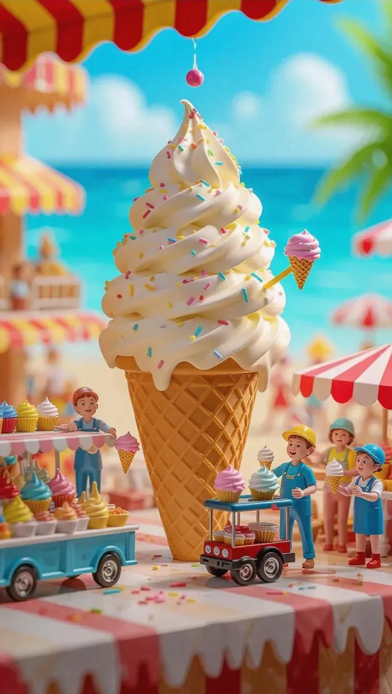 A cozy ice cream shop where a giant ice cream cone is being topped by tiny scoopers. A miniature cart rolls in fresh flavors, while small ice cream makers swirl and sprinkle toppings with delight. Some workers stack scoops like building blocks, while others drizzle syrup from tiny bottles. The refreshing scent of sweet treats floats by, while the blurred background reveals a charming seaside with beachgoers enjoying ice cream.
