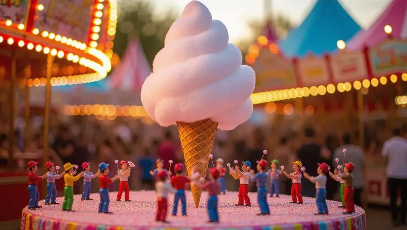 A vibrant festival where a giant cotton candy cone is being spun by tiny carnival workers. A miniature machine twirls sugar into fluff, while small artisans shape and decorate with sprinkles. Some workers hold the cone like a trophy, while others fluff the candy with tiny wands. The sweet scent of spun sugar wafts through the air, while the blurred background highlights colorful attractions and delighted festival-goers.