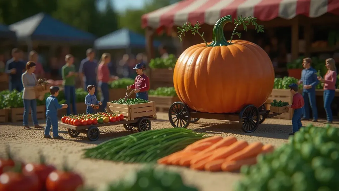 A lively farmers' market where a giant vegetable sculpture is being constructed by tiny farmers. A miniature cart rolls in fresh produce, while tiny artisans arrange and carve veggies with care. Some workers position carrots and tomatoes like building materials, while others add herbs from tiny pots. The earthy scent of fresh vegetables fills the air, while the blurred background reveals families shopping for organic goods.
