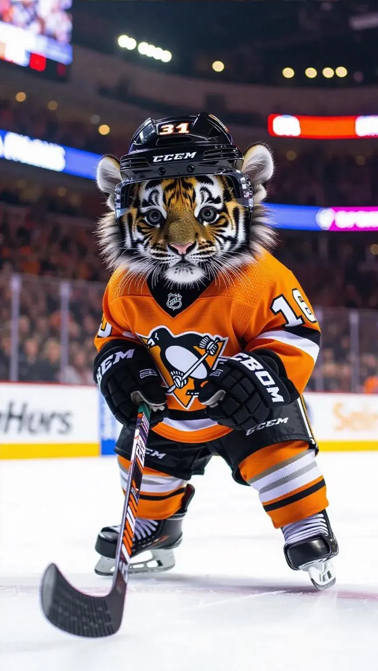 A 6-month-old, heavily overweight tiger cub stands on a professional ice hockey rink, wearing a tiny hockey jersey and matching helmet. Its thick, fluffy fur peeks out from the uniform, and its round body adds to its adorable yet determined look. The rink’s bright lights reflect off the ice, while the cheering crowd in the background adds excitement. The cub grips a mini hockey stick, appearing ready to play.