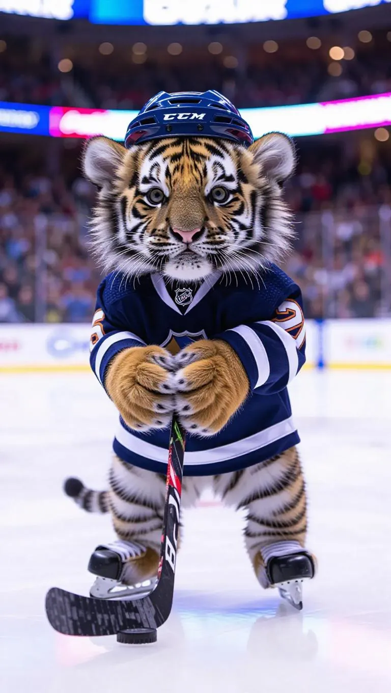 A 6-month-old, heavily oversized tiger cub stands on a well-lit ice hockey rink, adorned in a tiny hockey jersey and a quirky helmet. Its thick, fluffy fur frames its sweet face, giving it a humorous yet charming expression. The rink’s bright lights reflect dazzlingly off the ice, while the supportive crowd in the background fuels the atmosphere. The cub clutches a funky mini hockey stick, ready to join the fun.