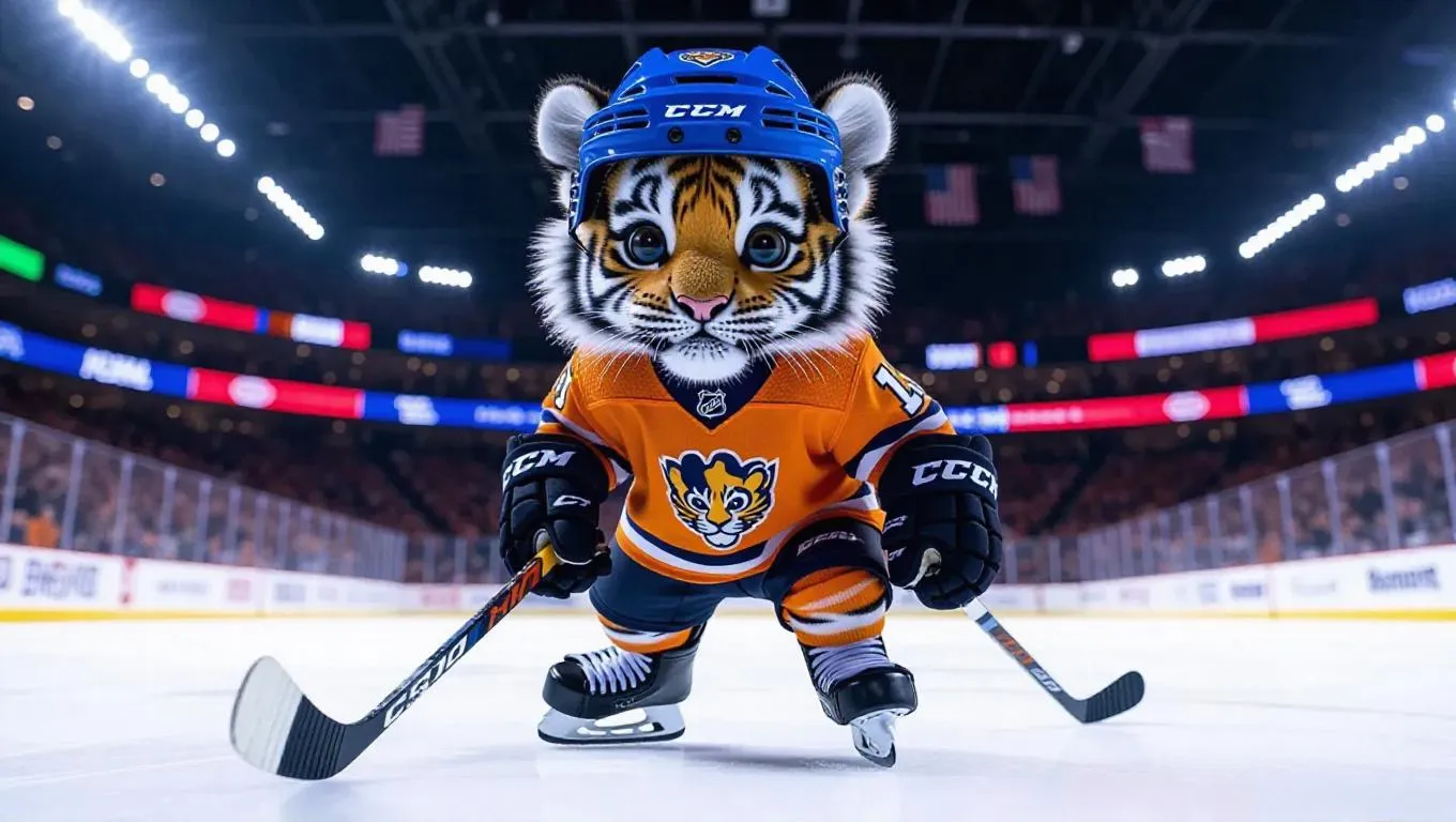 A 6-month-old, fluffy tiger cub stands on a chilly ice hockey rink, wearing a tiny hockey jersey with a superhero design and a vibrant helmet. Its thick fur tufts out, giving it a cute and cuddly look while keeping a determined stance. The rink shines brightly under the lights, while the lively crowd in the background cheers. The cub tightly grips a mini hockey stick, eager for its turn on the ice.