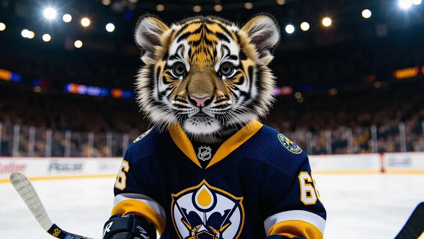 A 6-month-old, robust tiger cub stands on an ice hockey rink, dressed in a flashy hockey jersey that sparkles under the lights. Its plush fur cascades out from the uniform, adding to its adorable presence. The bright lights of the rink bounce off the ice, while the background crowd erupts in cheers. The cub holds a mini hockey stick, enthusiasm radiating from its round face.