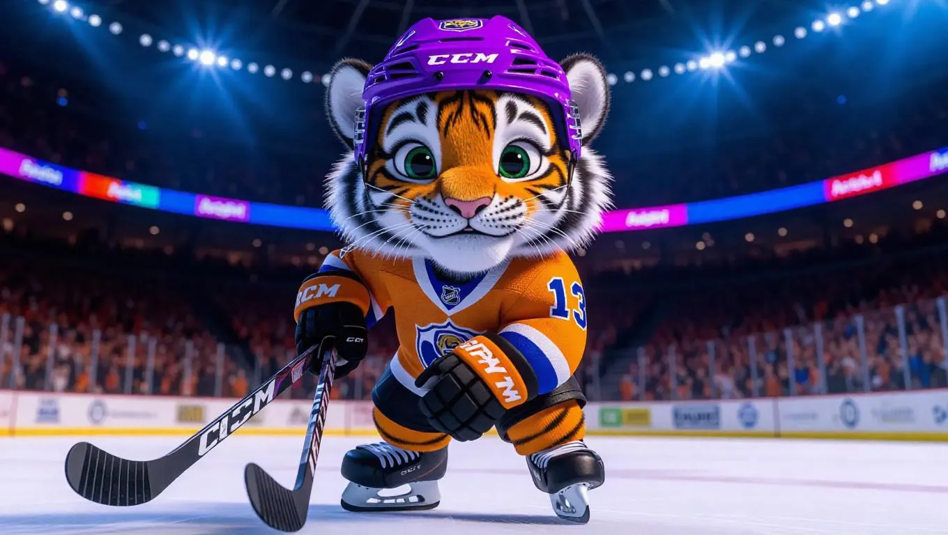A 6-month-old, slightly overweight tiger cub stands on a vibrant ice hockey rink, wearing a festive hockey jersey and a colorful helmet. The thick, fluffy fur adds a playful contrast to the uniform. The bright lights of the rink reflect on the ice, while the animated crowd in the background cheers with excitement. The cub brandishes a mini hockey stick, eager to take part in the game.