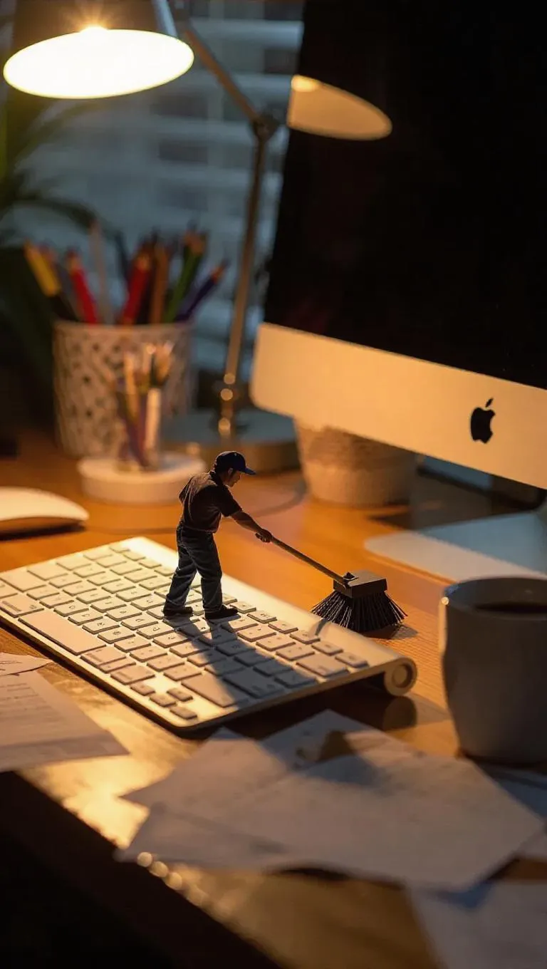 A tiny janitor with a miniature push broom diligently cleans a full-sized Mac keyboard on a cluttered office desk, surrounded by scattered papers, a steaming coffee cup, and a flickering desktop monitor, capturing the essence of a late-night office cleanup. The desk is illuminated by a warm desk lamp, casting soft shadows across the scene.