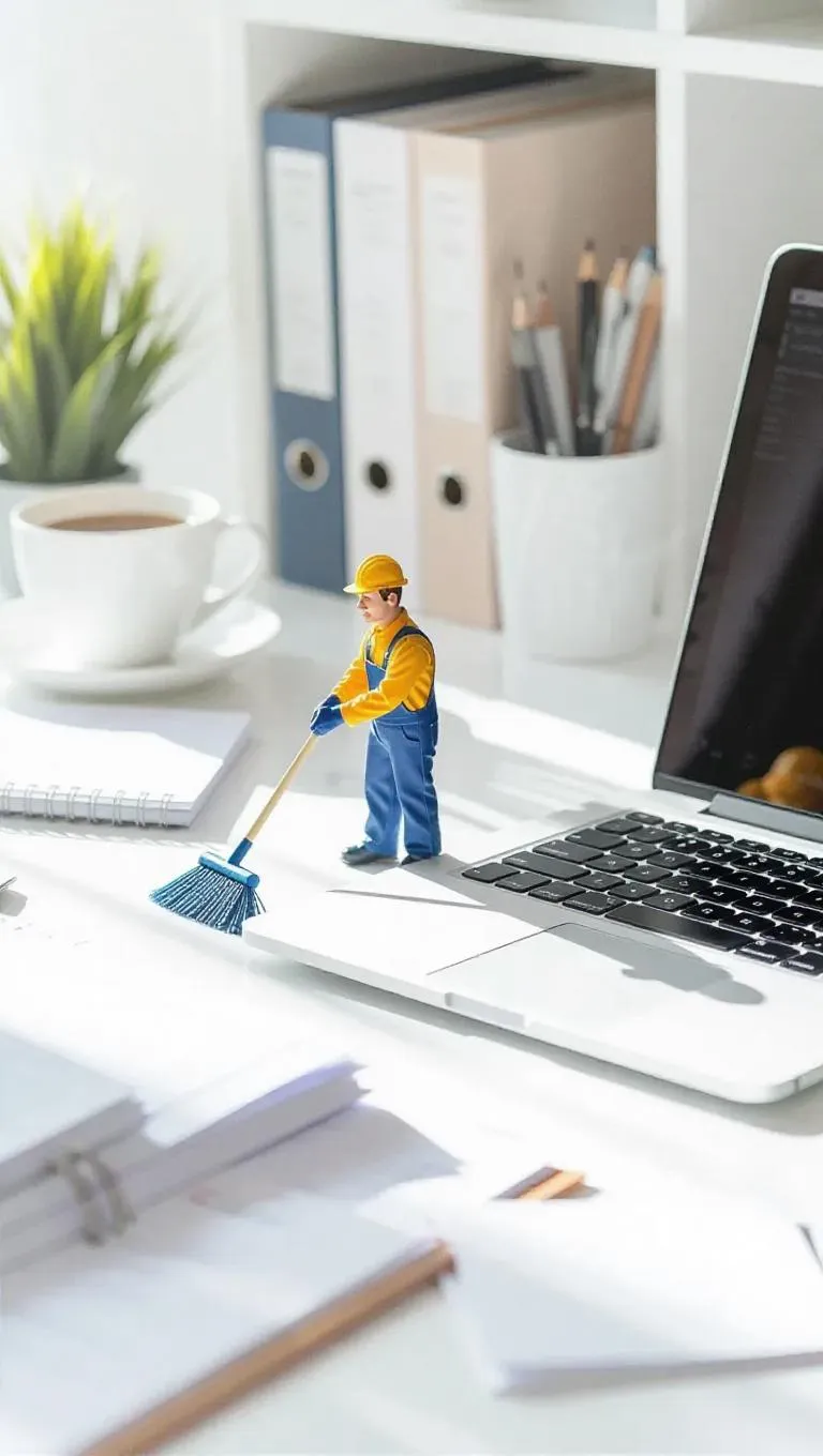 A tiny janitor with a miniature push broom diligently cleans a full-sized Mac keyboard on a pristine office desk, surrounded by organized folders, a steaming tea cup, and a glowing laptop screen, capturing the essence of a vibrant morning office rush. The desk is illuminated by a bright overhead light, casting sharp shadows across the scene.
