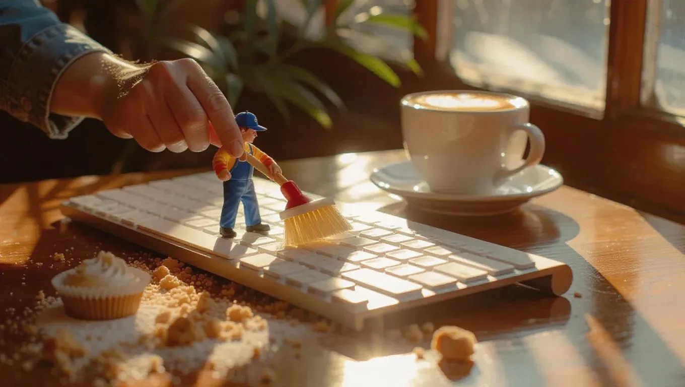 A tiny janitor with a toy brush daintily cleans a full-sized touchscreen keyboard on a cluttered café table, surrounded by pastry crumbs, a warm cappuccino, and a busy café atmosphere, capturing the essence of a cozy afternoon break. The table is illuminated by natural sunlight streaming through the window, casting bright shadows across the scene.