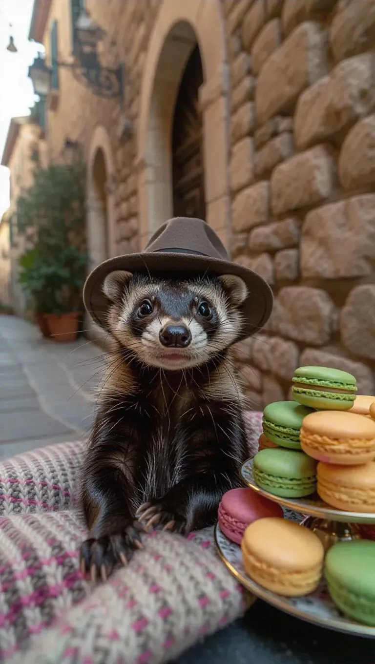 A ferret relaxes on a textured throw, wearing a fedora, and gives a cheeky look to the camera. Behind the ferret, an ancient stone wall looms. To the right of the ferret, there are a stack of macarons on a table beside a fresh kiwi. The scene takes place in an old town.