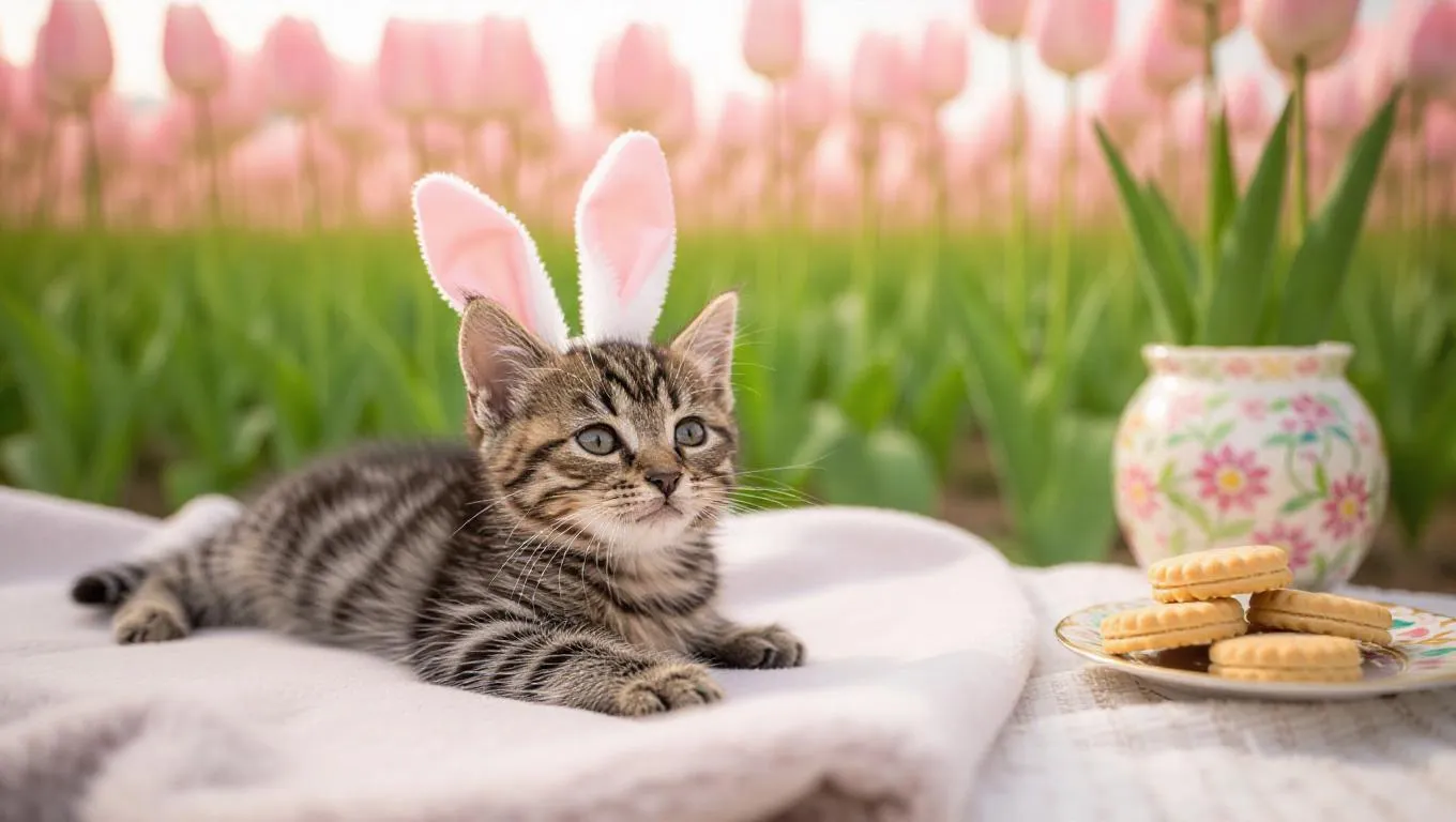 A kitten lies on a cozy blanket, wearing bunny ears, and stares dreamily at the camera. Behind the kitten, a field of tulips sways in the wind. To the right of the kitten, there are five biscuits on a table next to a decorative flower pot. The scene takes place in full bloom.