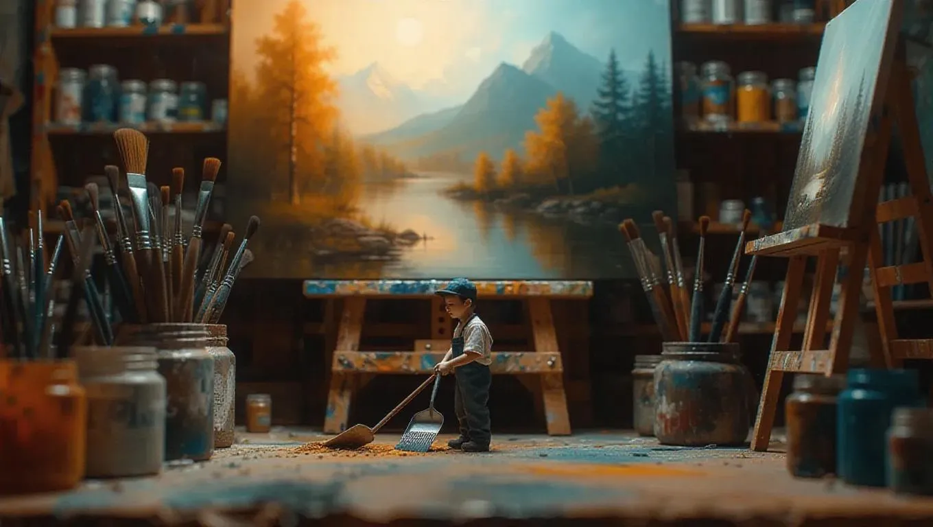 A tiny janitor with a miniature dustpan collects debris from a giant painting in an art studio, surrounded by paintbrushes, easels, and color palettes, capturing the essence of an artistic workspace cleanup. The scene is enhanced by the soft sound of brushes on canvas.