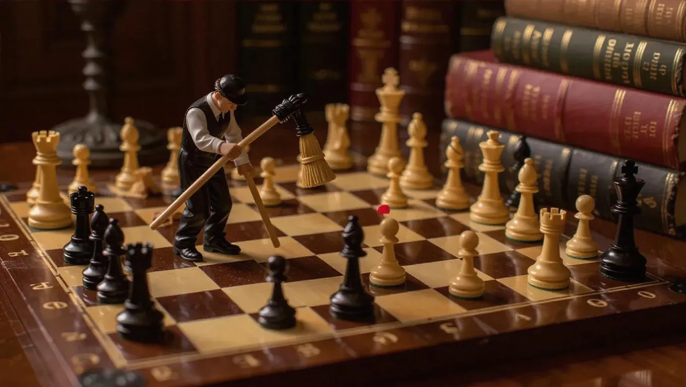 A tiny janitor with a miniature broom carefully sweeps a full-sized chessboard on a game table, surrounded by strategy books, timers, and score sheets, capturing the essence of a thoughtful game cleanup. The scene is enhanced by the sound of pieces moving.