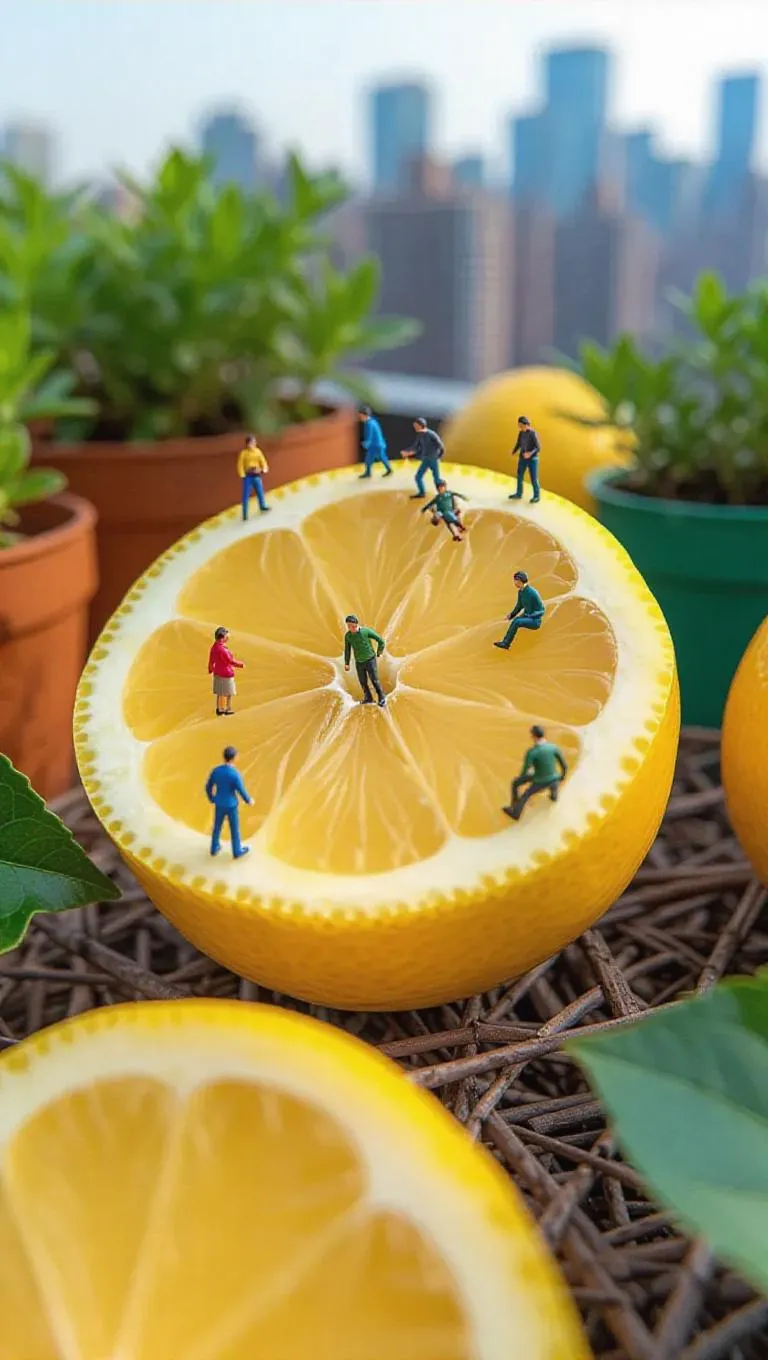 The camera begins with a close-up of the intricate details of the lemon slices, showcasing the vibrant yellow flesh and seeds. It then performs a slow push-in, gradually revealing miniature thumb-sized people engaged in various activities around the lemons. The figures move subtly, enhancing the sense of depth and playfulness. The natural textures of the surrounding twigs and greenery remain in focus, adding to the scene's charm. The setting is a vibrant urban rooftop garden with city skylines and colorful pots.