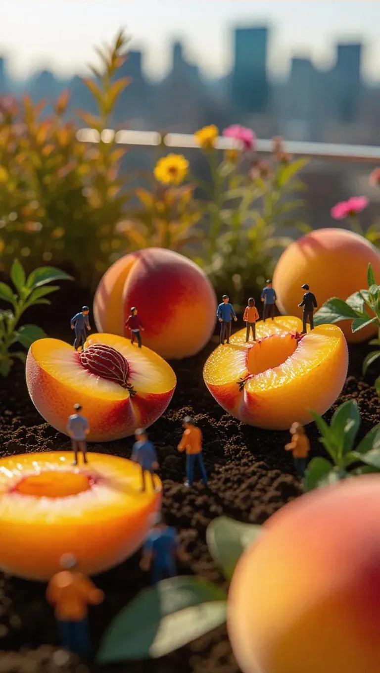 The camera begins with a close-up of the intricate details of the peach halves, showcasing the vibrant orange flesh and yellow pit. It then performs a slow push-in, gradually revealing miniature thumb-sized people engaged in various activities around the peaches. The figures move subtly, enhancing the sense of depth and playfulness. The natural textures of the surrounding soil and ornamental plants remain in focus, adding to the scene's charm. The setting is a vibrant urban rooftop garden with city skylines and colorful decor.