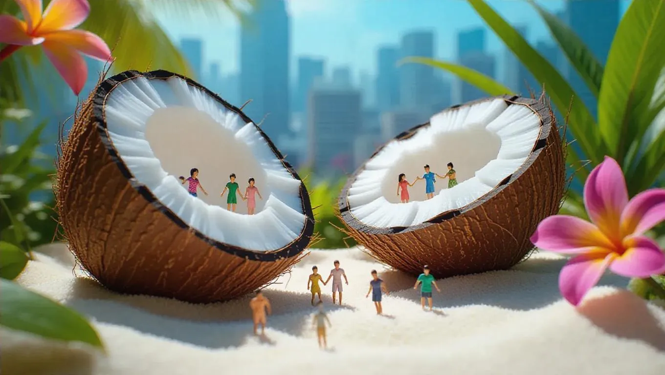 The camera begins with a close-up of the intricate details of the coconut halves, showcasing the vibrant white flesh and brown shell. It then performs a slow push-in, gradually revealing miniature thumb-sized people engaged in various activities around the coconut. The figures move subtly, enhancing the sense of depth and playfulness. The natural textures of the surrounding sand and tropical plants remain in focus, adding to the scene's charm. The setting is a vibrant urban rooftop garden with city skylines and colorful tropical decor.