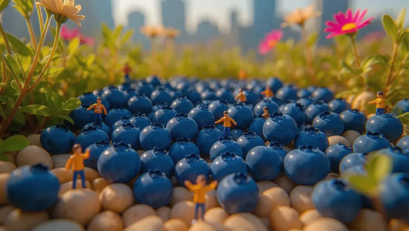 The camera begins with a close-up of the intricate details of the blueberry clusters, showcasing the vibrant blue skins and tiny seeds. It then performs a slow push-in, gradually revealing miniature thumb-sized people engaged in various activities around the blueberries. The figures move subtly, enhancing the sense of depth and playfulness. The natural textures of the surrounding pebbles and green plants remain in focus, adding to the scene's charm. The setting is a vibrant urban rooftop garden with city skylines and colorful summer decorations.