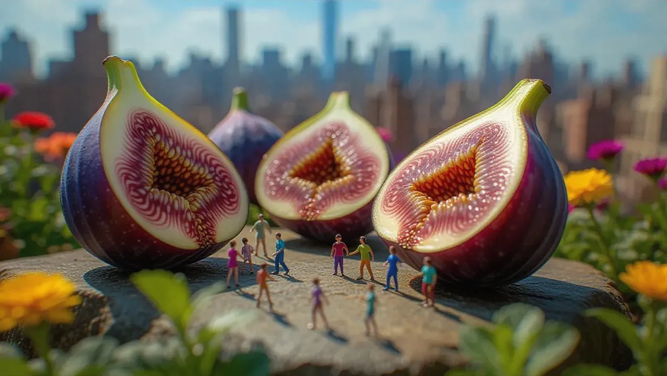 The camera begins with a close-up of the intricate details of the fig halves, showcasing the vibrant purple flesh and seeds. It then performs a slow push-in, gradually revealing miniature thumb-sized people engaged in various activities around the figs. The figures move subtly, enhancing the sense of depth and playfulness. The natural textures of the surrounding rocks and greenery remain in focus, adding to the scene's charm. The setting is a vibrant urban rooftop garden with city skylines and colorful flower arrangements.