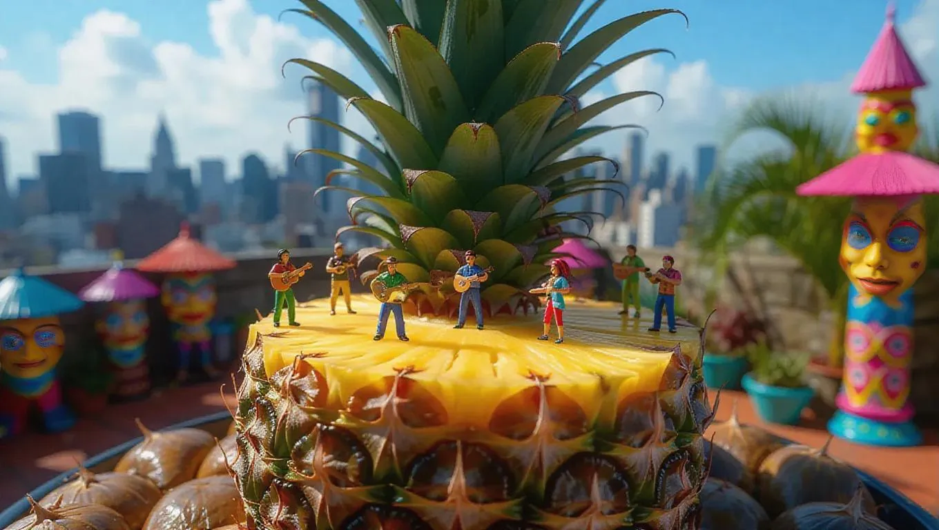 The camera begins with a close-up of the intricate details of the pineapple slices, showcasing the vibrant yellow flesh and eyes. It then performs a slow push-in, gradually revealing miniature thumb-sized people engaged in various activities around the pineapple. The figures move subtly, enhancing the sense of depth and playfulness. The natural textures of the surrounding stones and tropical plants remain in focus, adding to the scene's charm. The setting is a vibrant urban rooftop garden with city skylines and colorful tiki decor.