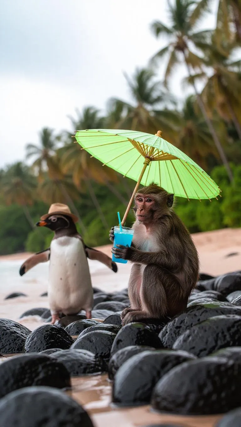 A monkey is sitting on a rocky beach, holding a blue drink in one hand and a green umbrella in the other. The penguin is wearing a hat and seems to be enjoying the cloudy weather. In the background, there are tall palm trees.