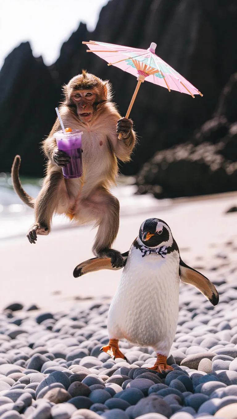 A monkey is jumping on a rocky beach, holding a purple drink in one hand and a floral umbrella in the other. The penguin is wearing a bowtie and seems to be enjoying the breezy weather. In the background, there are rocky outcrops.
