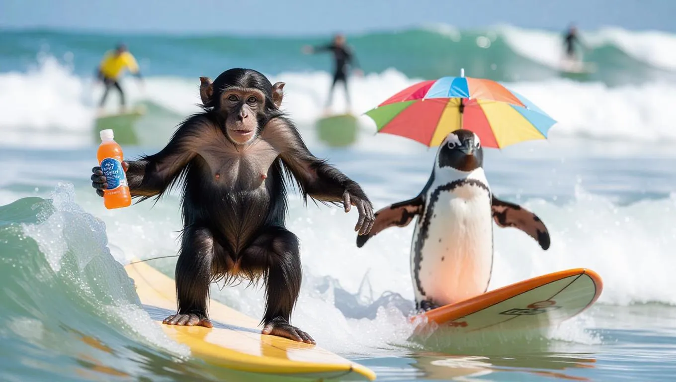 A monkey is surfing on waves near the beach, holding a sports drink in one hand and a surfboard-shaped umbrella in the other. The penguin is wearing a wetsuit and seems to be enjoying the adventure. In the background, there are surfers riding the waves.