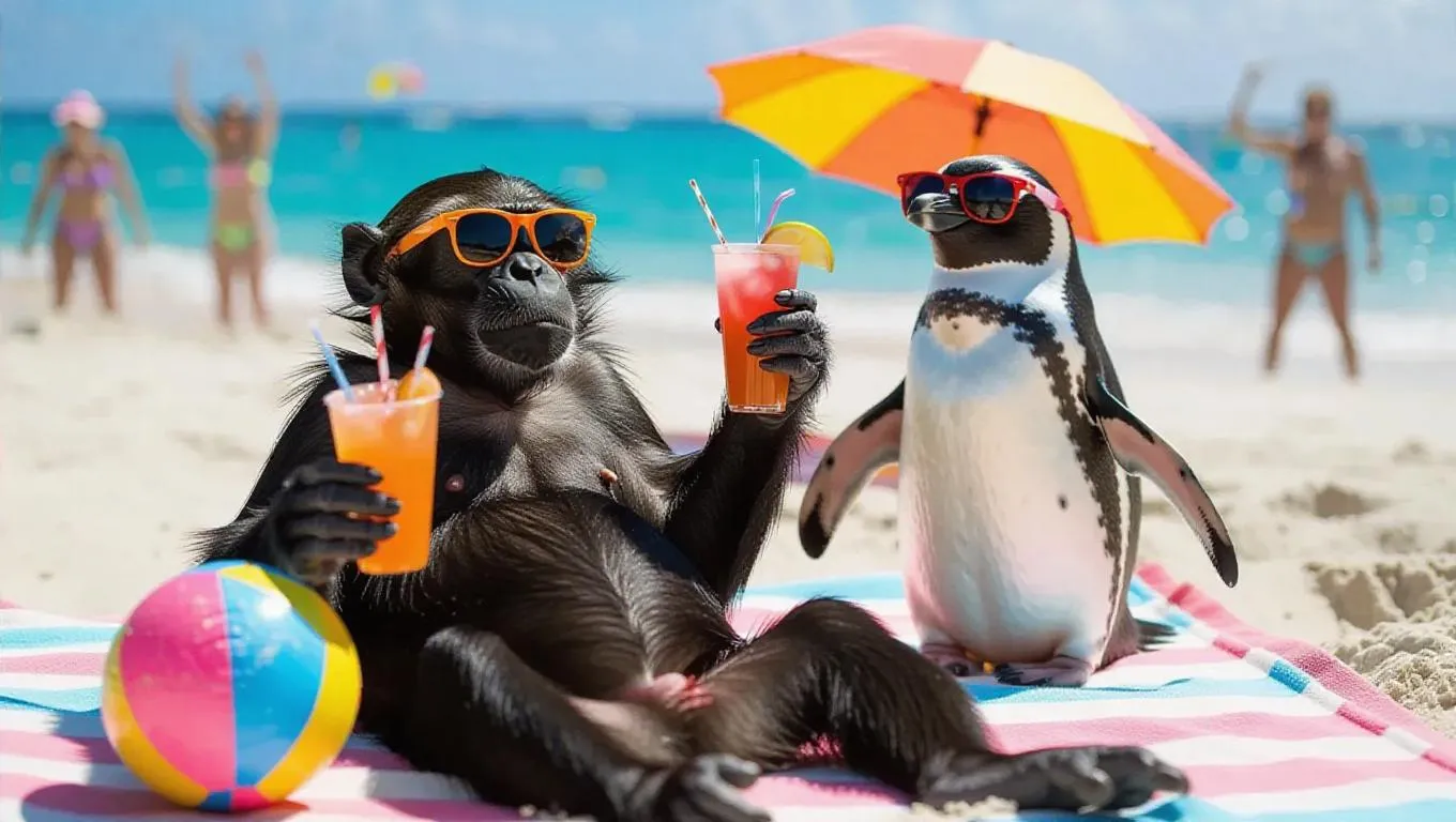 A monkey is sunbathing on a towel on the beach, holding a tropical cocktail in one hand and a beach ball umbrella in the other. The penguin is wearing sunglasses and seems to be enjoying the lively atmosphere. In the background, there are people playing volleyball.