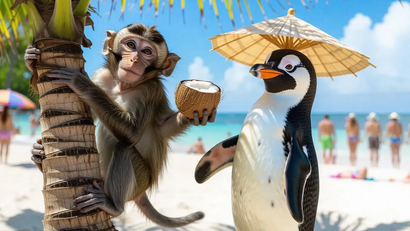 A monkey is climbing a coconut tree on the beach, holding a fresh coconut in one hand and a palm tree umbrella in the other. The penguin is wearing a beach hat and seems to be enjoying the lively crowd. In the background, there are beachgoers near the water.
