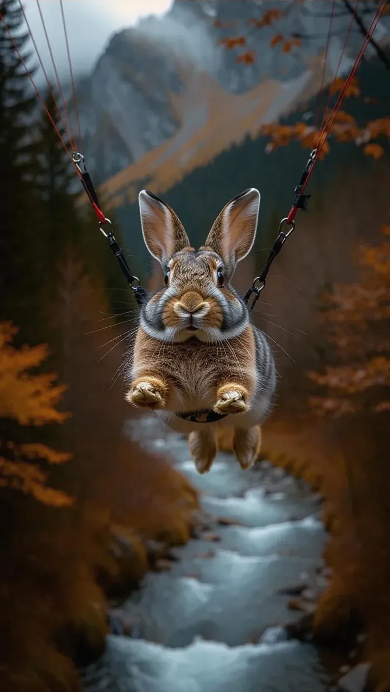 The rabbit hang glides through the shot flashing a joyful expression and a wave, with a frosty stream winding through the valley beneath.