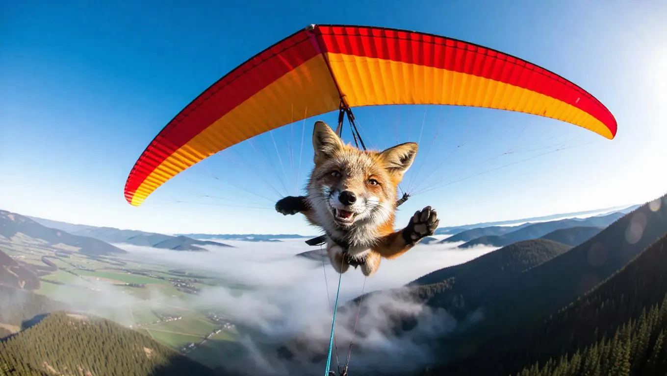 The fox hang glides through the shot with a playful grin and a wave, with a misty valley stretching beneath.