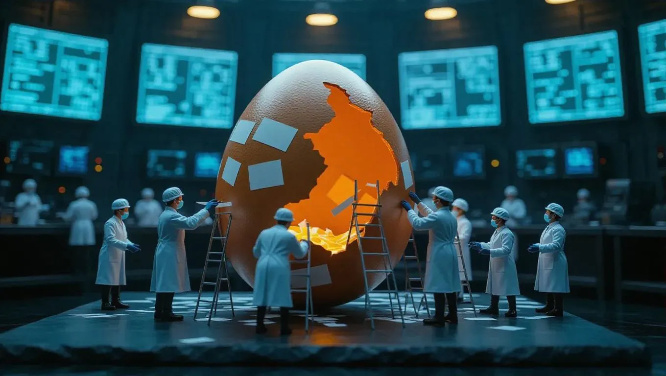 The large cracked egg on the slate surface is the focal point as tiny workers in lab coats climb ladders, meticulously placing bandages over the broken shell. Some workers hold the bandages in place while others smooth them out. A few are on the ground, cutting new bandage strips and passing them up. The camera pans slowly from the ground level to the top of the egg, capturing the detailed and steady pace of their teamwork in repairing the egg. The scene is set in a high-tech laboratory with glowing screens, creating a futuristic and innovative atmosphere.