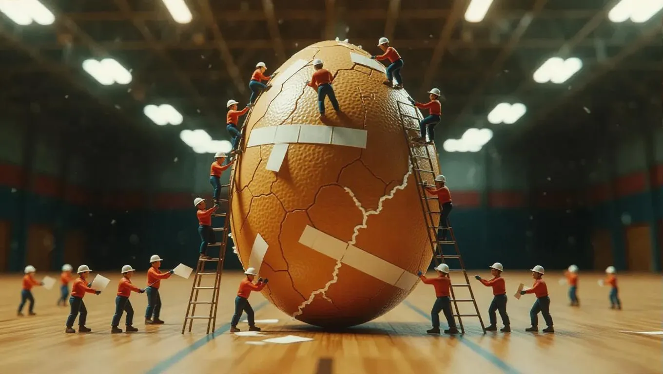 The large cracked egg on the rubber surface is the focal point as tiny workers in sports gear climb ladders, meticulously placing bandages over the broken shell. Some workers hold the bandages in place while others smooth them out. A few are on the ground, cutting new bandage strips and passing them up. The camera pans slowly from the ground level to the top of the egg, capturing the detailed and steady pace of their teamwork in repairing the egg. The scene is set in a gymnasium with bright lights, creating an energetic and dynamic atmosphere.