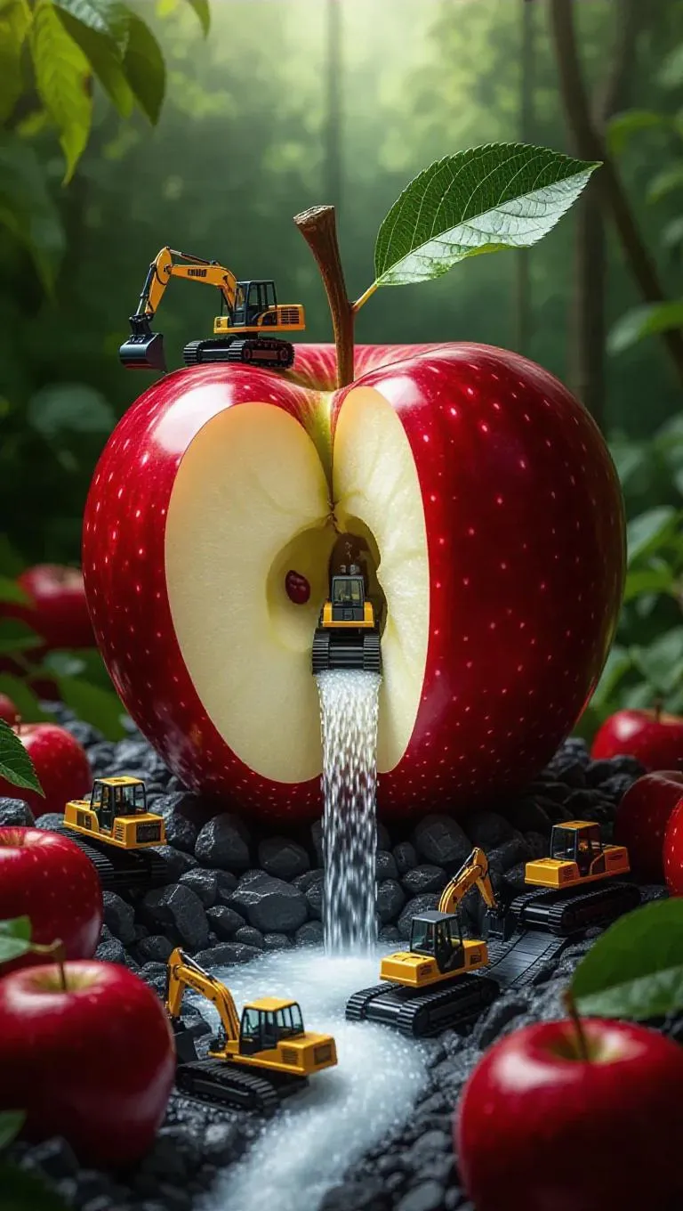 A surreal scene of tiny workers mining a massive apple as if it were a rock quarry. Excavators and pickaxes carve into the juicy flesh, while conveyor belts transport apple segments like giant boulders. Apple juice flows down like a refreshing waterfall, creating a stunning contrast against the bright red peel. The background features a lush tropical forest, adding to the vibrant atmosphere.