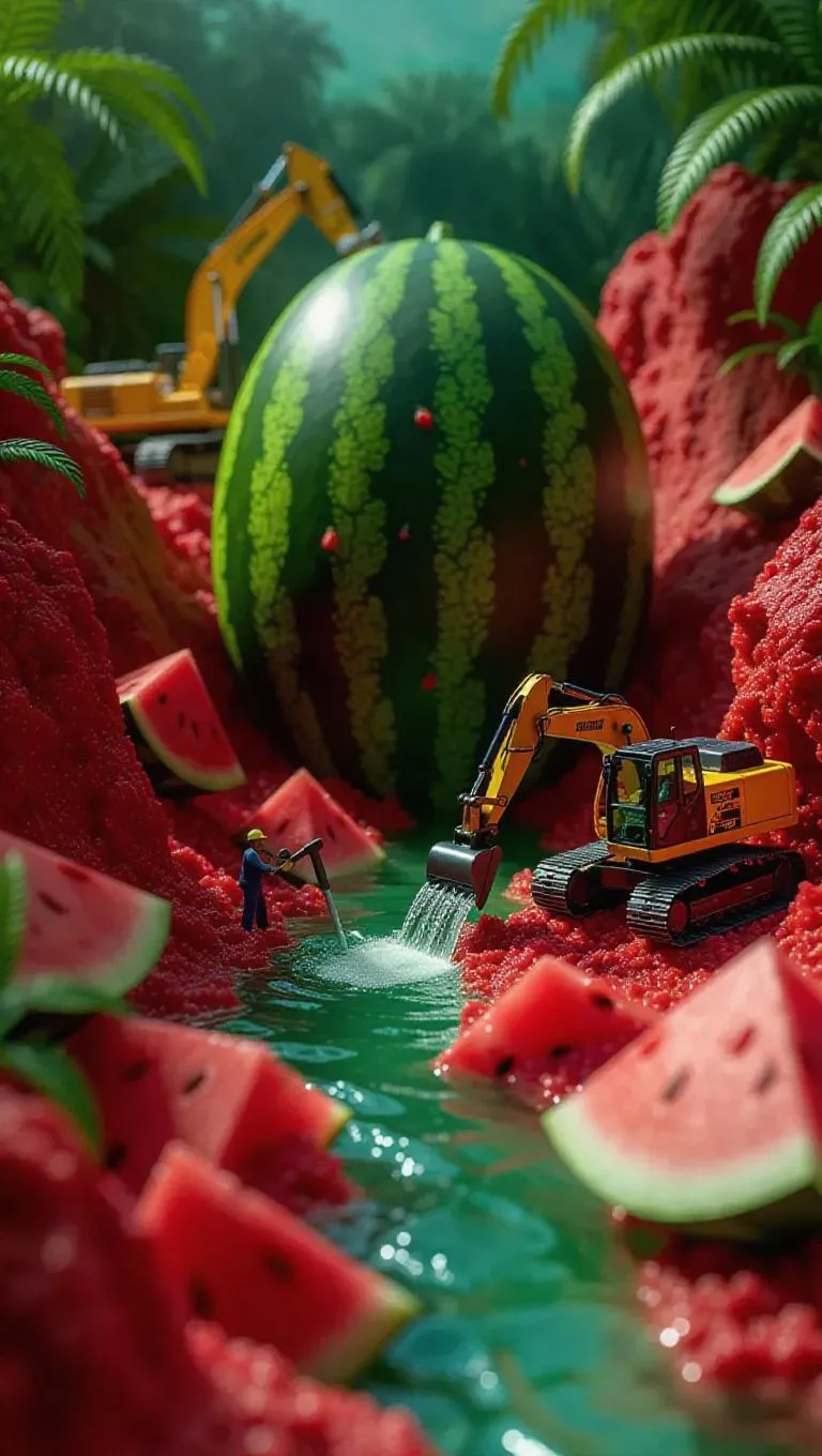A surreal scene of tiny workers mining a massive watermelon as if it were a rock quarry. Excavators and pickaxes carve into the juicy flesh, while conveyor belts transport watermelon segments like giant boulders. Watermelon juice flows down like a refreshing waterfall, creating a stunning contrast against the bright green rind. The background features a lush tropical forest, adding to the vibrant atmosphere.