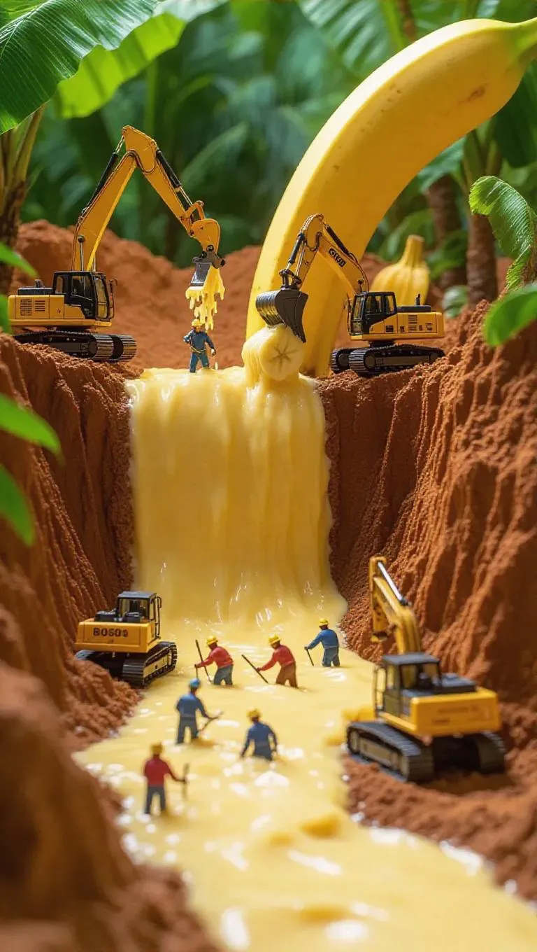 A surreal scene of tiny workers mining a massive banana as if it were a rock quarry. Excavators and pickaxes carve into the creamy flesh, while conveyor belts transport banana segments like giant boulders. Banana puree flows down like a refreshing waterfall, creating a stunning contrast against the yellow peel. The background features a lush tropical forest, adding to the vibrant atmosphere.