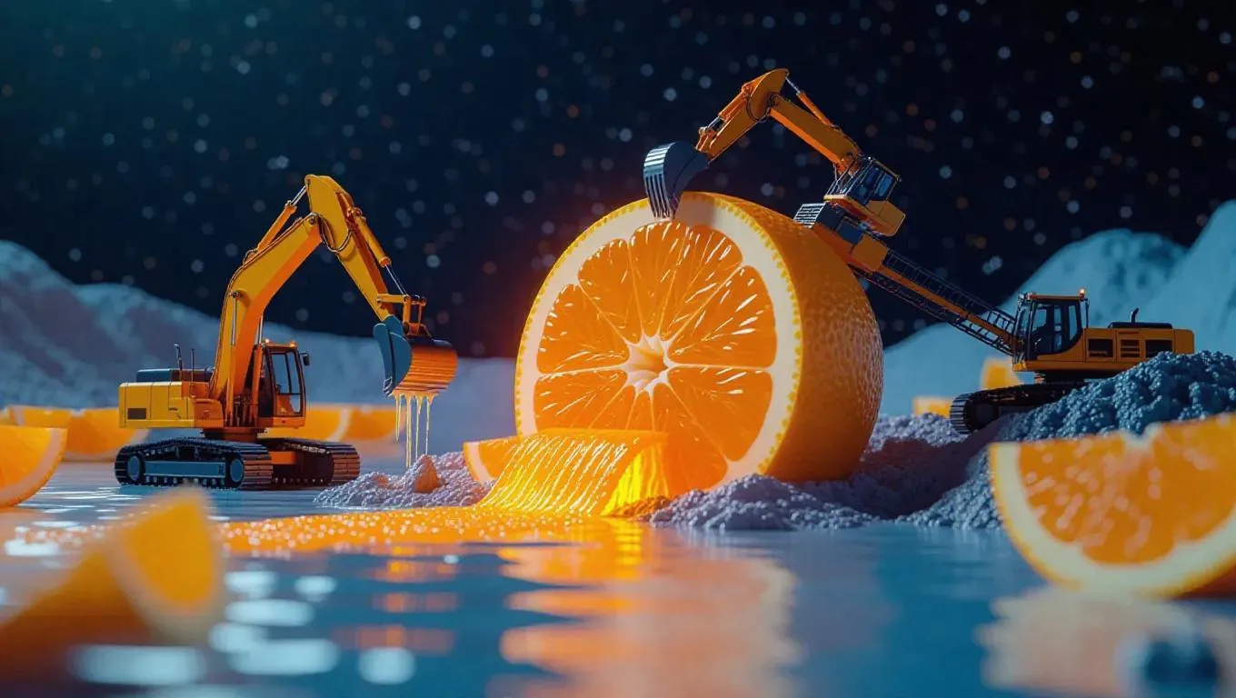 A surreal scene of tiny workers mining a massive orange under a starlit sky. Excavators and pickaxes carve into the juicy flesh, while conveyor belts transport orange segments like giant boulders. Orange juice flows down like a refreshing waterfall, creating a stunning contrast against the bright orange peel. The background features twinkling stars, adding to the vibrant atmosphere.