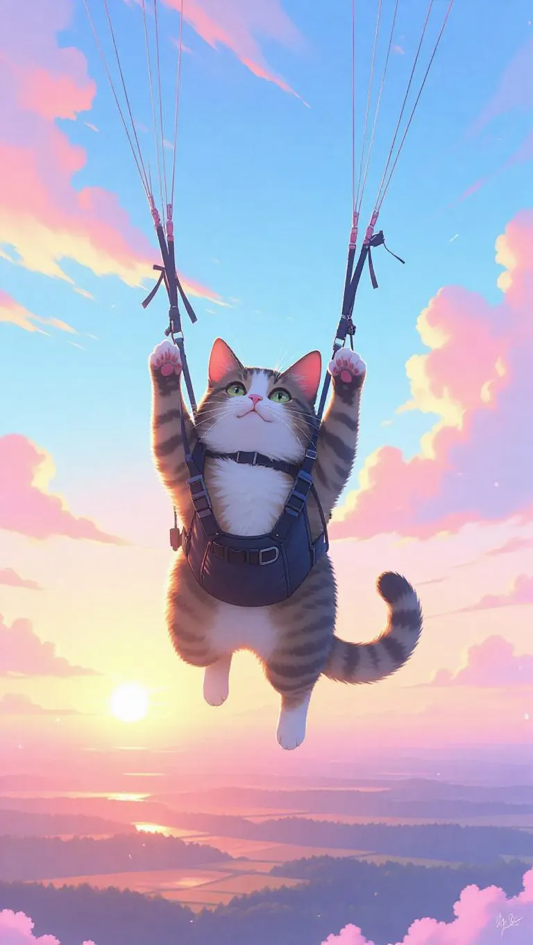 The cat hang glides effortlessly across the scene sporting a silly face and a wink, amidst a pastel sunset painting the sky with soft colors.