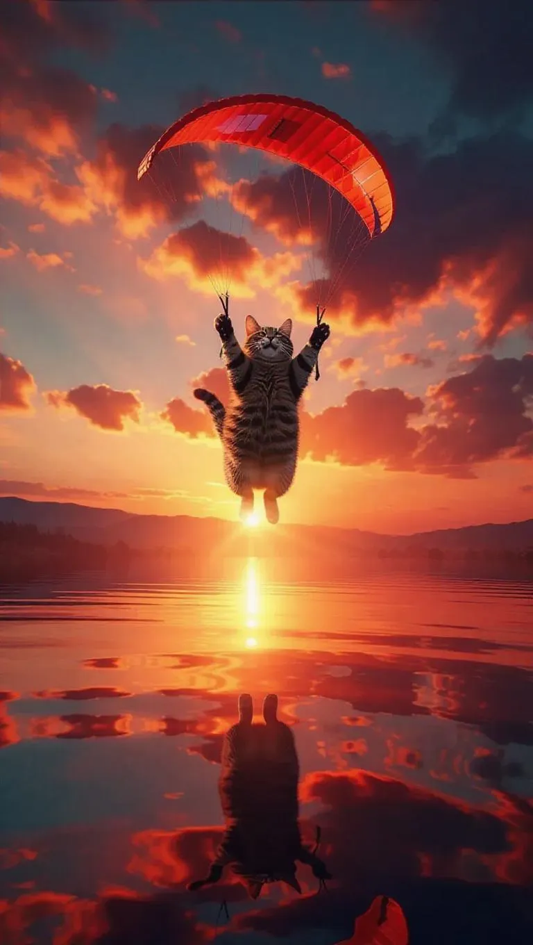 The cat hang glides through the scene with a wide smile and a flying pose, framed by a fiery sunset reflecting off the water.