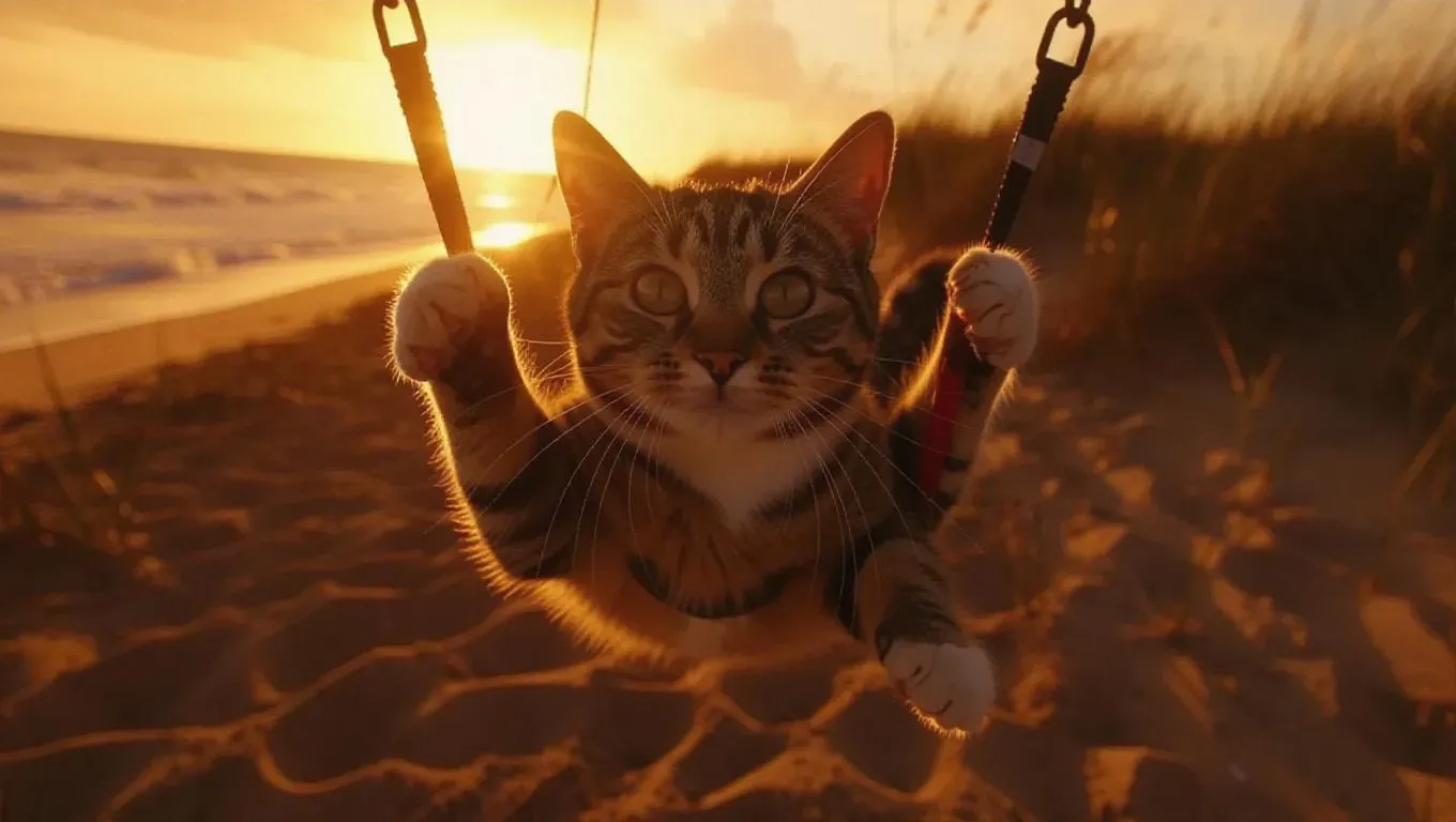 The cat hang glides through the frame with a radiant smile and a friendly wave, as a dramatic sunset creates shadows over the sandy beach.