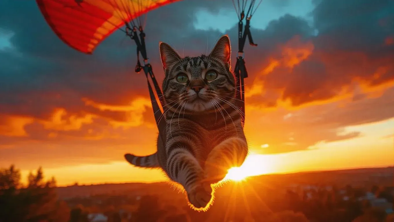 The cat hang glides through the scene with a confident smile and raising one eyebrow, amid a fiery sunset that energizes the atmosphere.