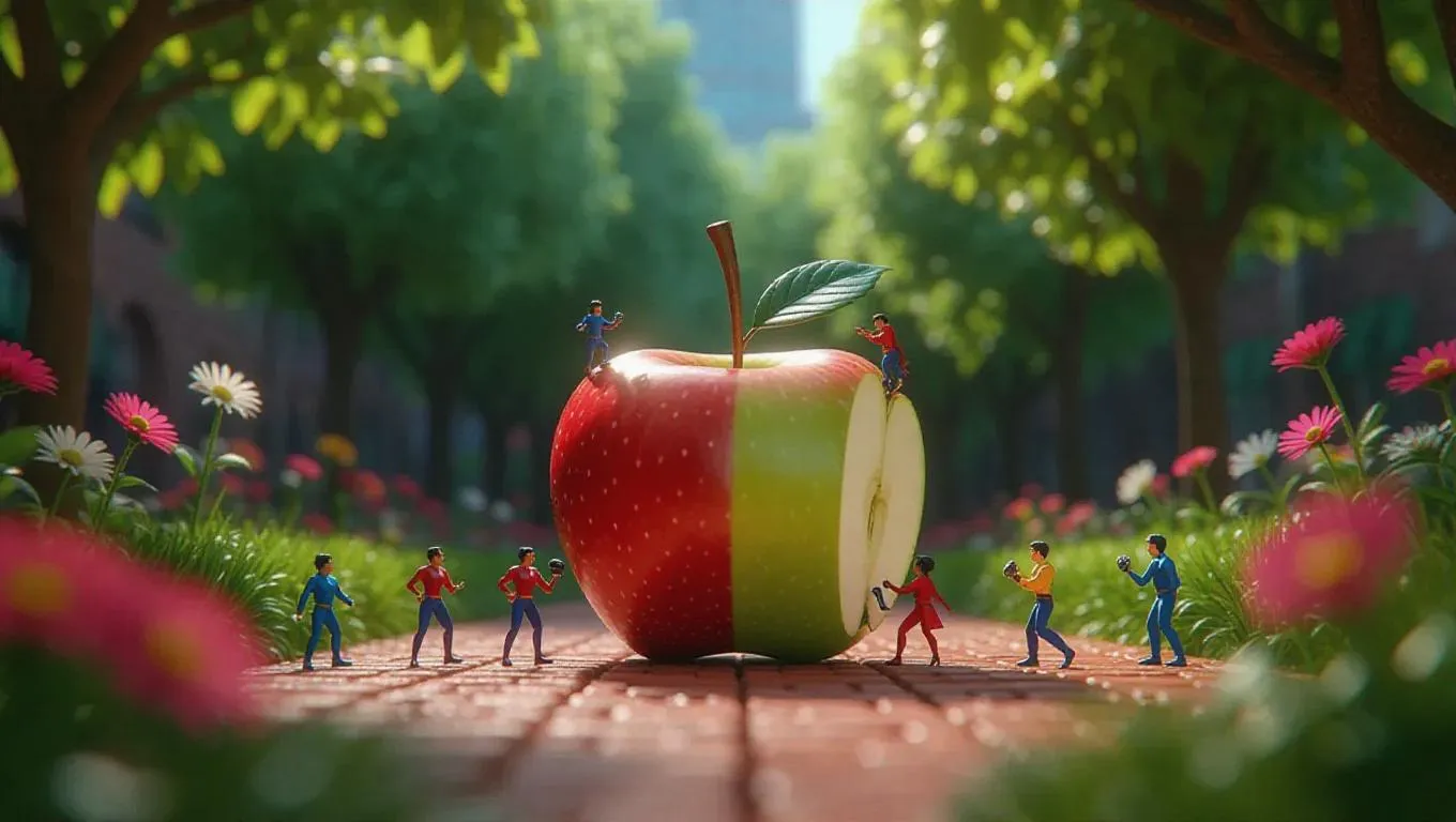 The camera begins with a close-up of the lush details of the apple slices, showcasing the bright red and light green flesh. It then performs a slow push-in, gradually revealing miniature superhero-sized characters engaged in various activities around the apple. The figures move boldly, enhancing the sense of depth and excitement. The natural textures of the surrounding bricks and flowers remain in focus, adding to the scene's charm. The setting is a vibrant city park with tall trees and a lively atmosphere.