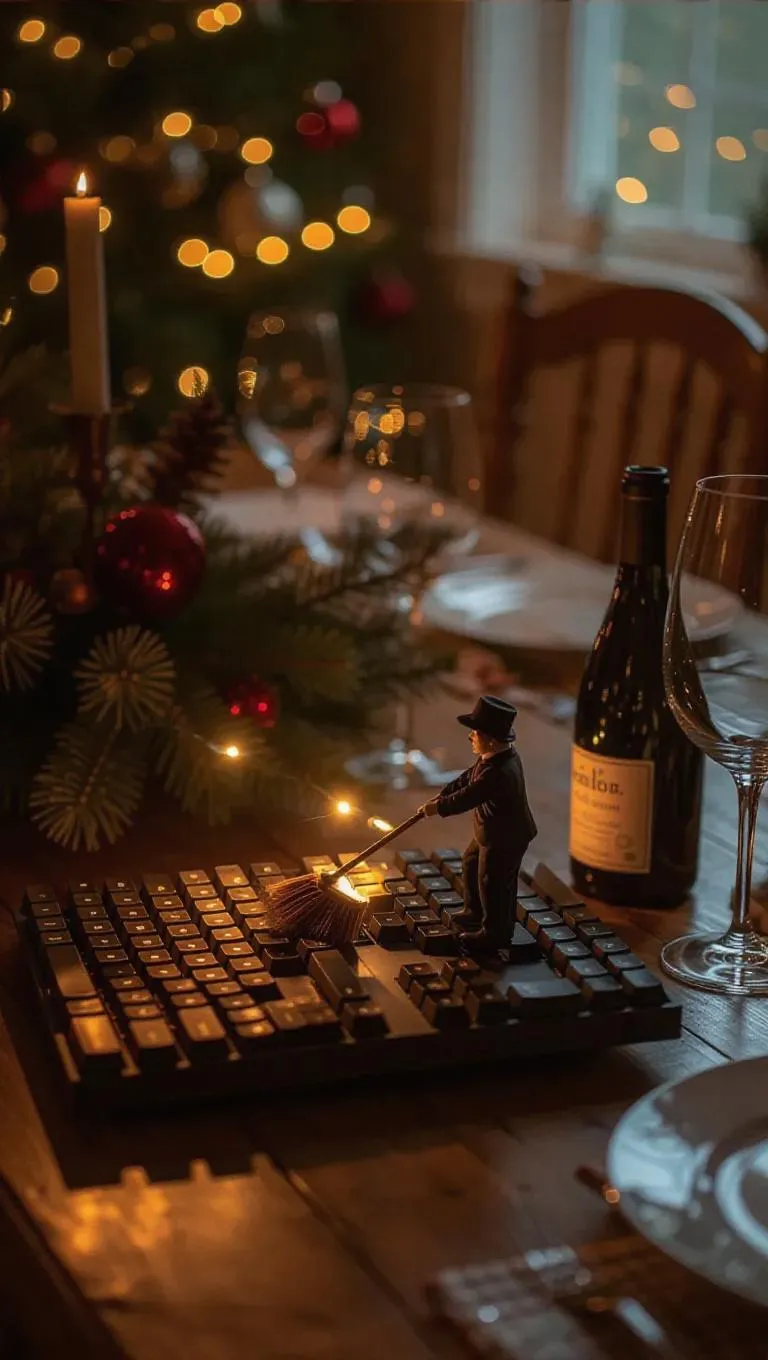 A tiny janitor with a miniature push broom diligently cleans a full-sized Mac keyboard on a wooden dining table, surrounded by festive decorations, an unopened bottle of wine, and a small potted plant, capturing the essence of a family gathering cleanup. The table is illuminated by soft fairy lights.