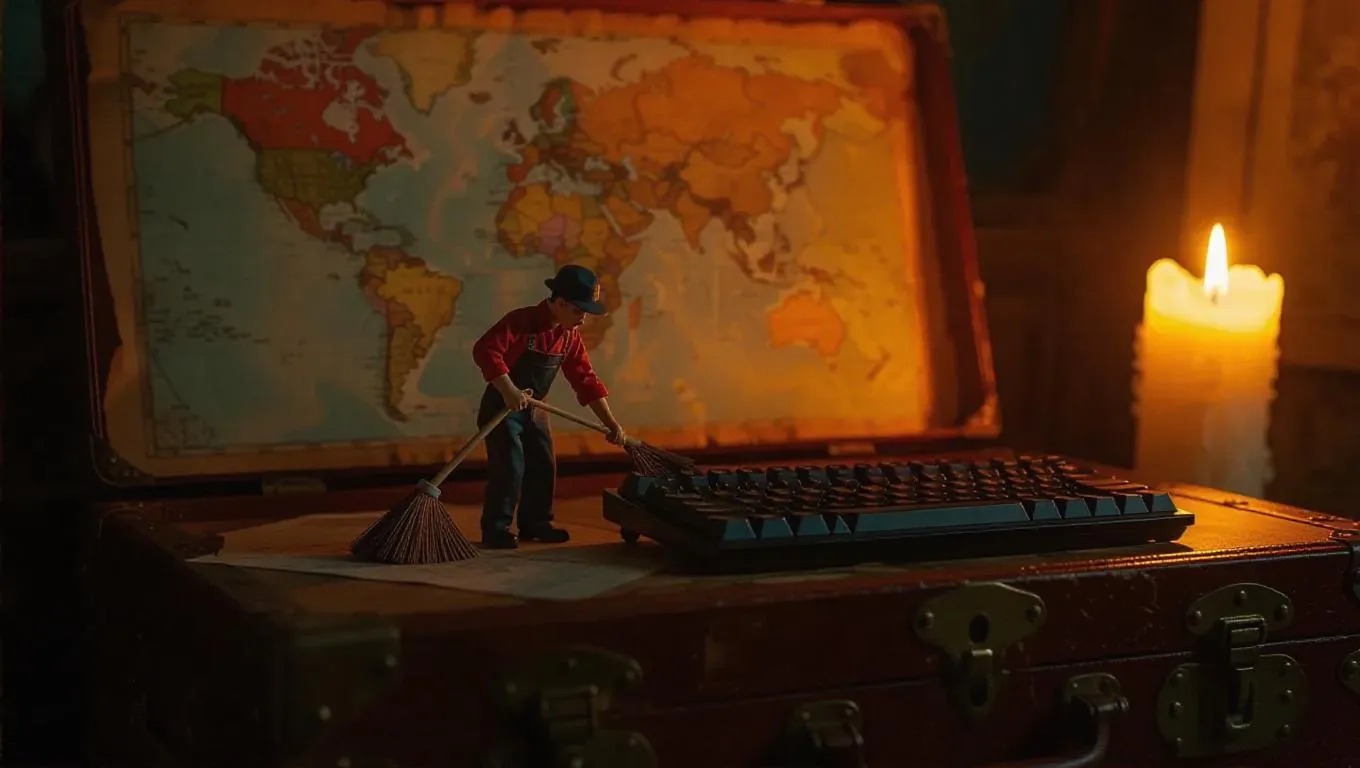 A tiny janitor with a miniature push broom diligently cleans a full-sized Mac keyboard on a vintage trunk, surrounded by old maps, travel souvenirs, and dim candlelight, capturing the essence of post-travel unpacking. The trunk is illuminated by the flickering candle glow.