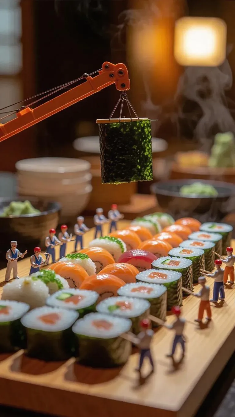 A playful culinary construction site where a massive sushi platter is being assembled by thumb-sized workers. A miniature crane carefully lifts a fresh sheet of nori, while tiny chefs spread rice with small spatulas. Some workers arrange slices of fish into place like jewels, while others carefully roll the sushi with tiny bamboo mats. Steam rises gently, hinting at the freshness of the ingredients, while the blurred background reveals a serene Japanese restaurant with sake and miso soup nearby.
